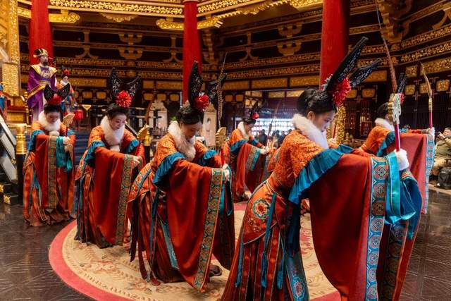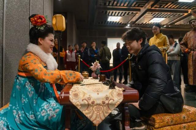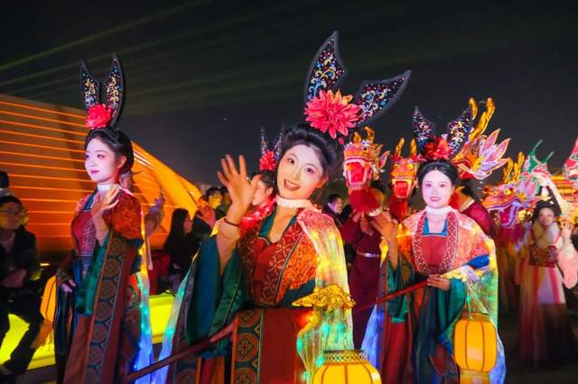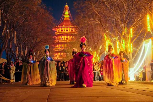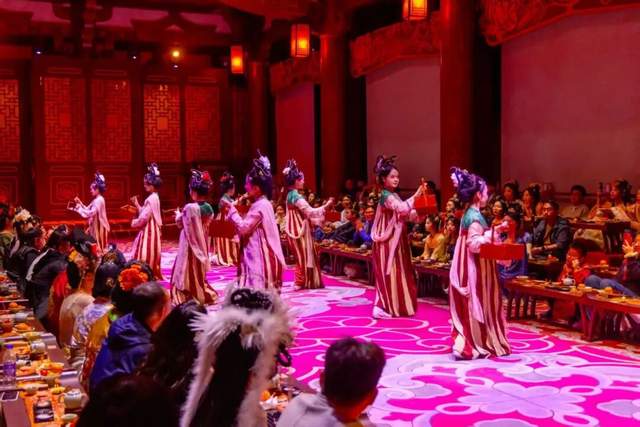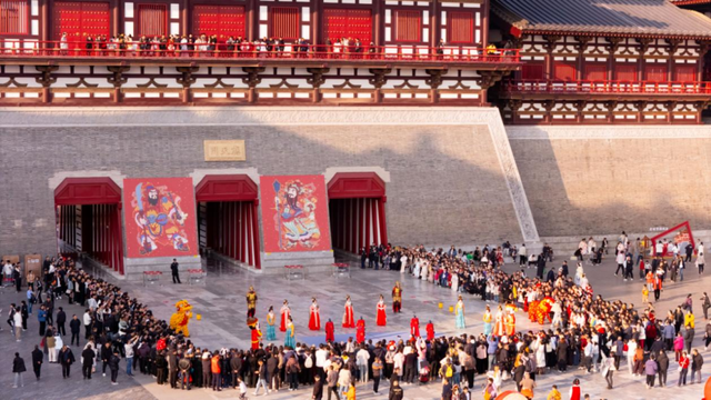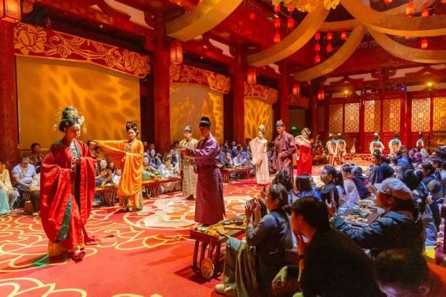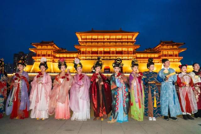 暮色四合,应天门夜间限定演艺《簪花同乐·万国掌灯》开演,以牡丹为媒,舞蹈、礼乐、吟诵轮番上演,共织一场盛唐梦境。