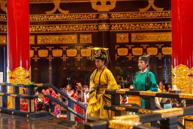 金吾卫列阵击鼓,迎宾宫女踏歌而舞,应天门开园盛典恢弘启幕,仪式感瞬间拉满,你的神都之行即刻启程。踏入应天门二层平台,大唐官员教授叉手礼,一鞠一躬尽显盛唐风仪;波斯幻术师摇扇含笑,吐蕃力士热情豪迈,高丽舞姬随鼓轻舞,大唐商贾邀你体验丝路坚韧......赏绝妙表演的同时,开启“花朝特使”的寻簪之旅。