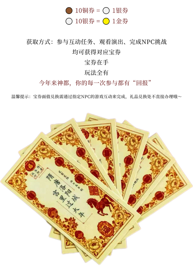 不仅如此,神宫宝券全新升级,参与景区内互动任务、观看演出、完成NPC挑战,均可获得对应面额宝券,让你的每一次参与,都有“回报”。