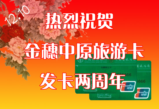 2005年12月10日,河南省旅游局与中国农业银行河南省分行合作推出的金穗中原旅游卡正式发卡。截至今日,金穗中原旅游卡发卡突破25万张,并成为河南旅游的一个知名品牌。