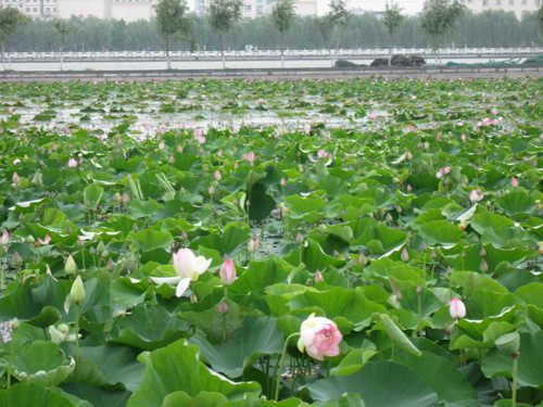 “接天莲叶无穷碧,映日荷花别样红” 北湖景区荷花苑位于铁人广场西50米,面积7000平方米,建于2008年3月。荷花苑中的观赏荷花共26个品种,分别从北京圆明园、湖北武汉、山东临沂等地引进。观赏荷花亦称花莲,以植株高大、花色鲜艳著称,超尘脱俗,出淤泥而不染。其中的亚马逊王莲属大型水体绿化植物,形体大,在我国北方叶径可达1.2-1.6米,外形美观,浮叶可托起20多公斤重的儿童,堪称莲中之魁。