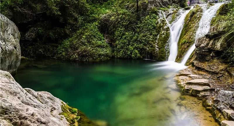 潭瀑峡地处云台山北部略偏西,是主要河流子房河的一个源头。沟长1270米,南北走向。沟东面,峭壁耸翠,基岩裸体。沟西面,竞秀峰参差俏丽,峰群一字排列,峰峰直立,争奇斗异。
