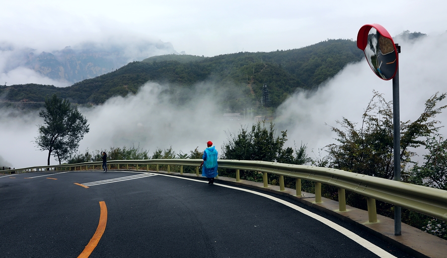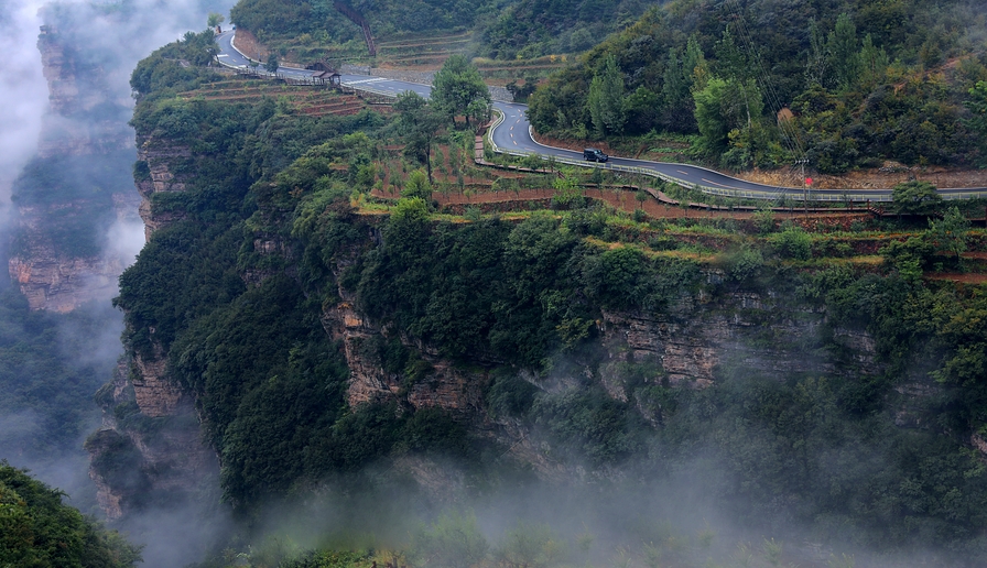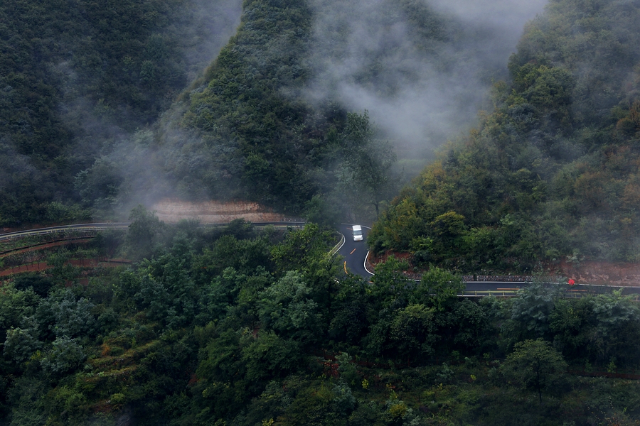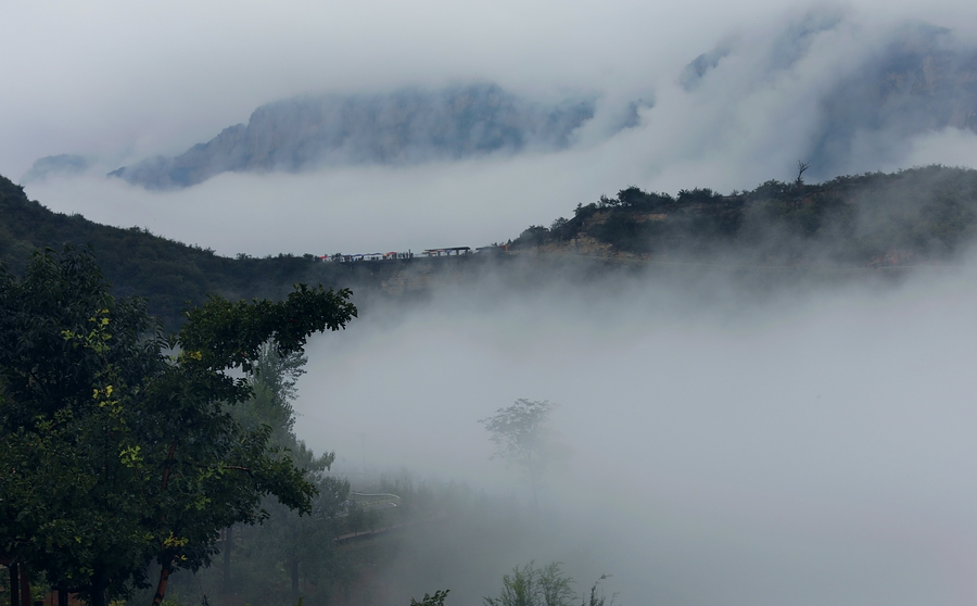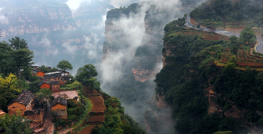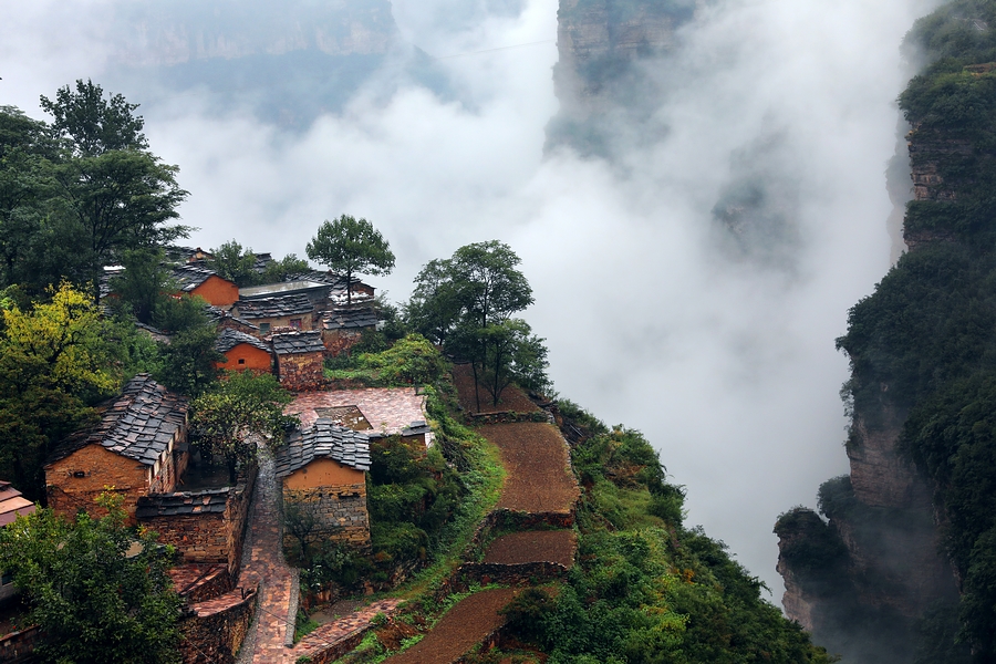 一阵阵白雾沿着陡峭,淹没了梯田,淹没了农家,瞬间又云开雾散。