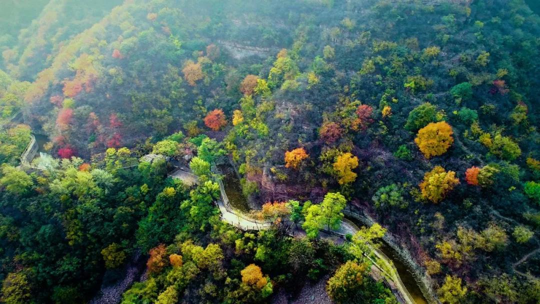 太行山脉不再是单调的绿色,层林尽染,色彩斑斓,所有浓烈的色块撞在一起,仿佛是画家笔下一幅绚烂的油画,每一个画面都散发着浓浓的秋意,美得张扬、美得人心醉。
