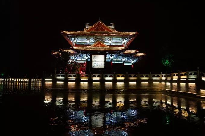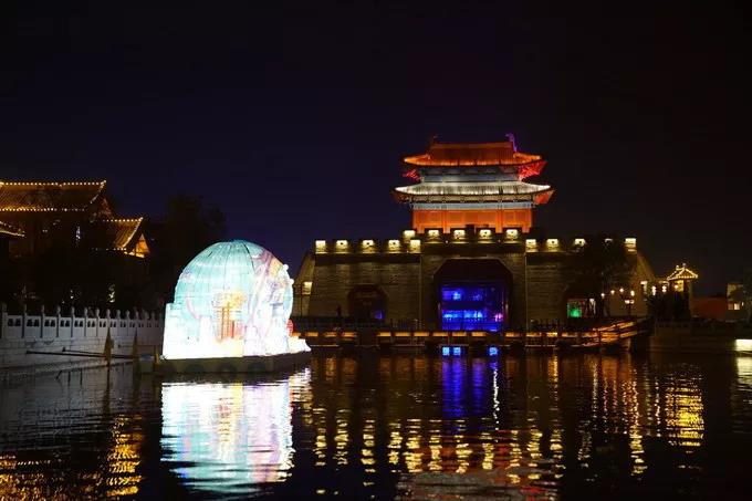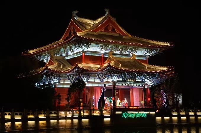 两岸灯光影绰、阁亭遍布其间,歌声、戏曲声南北呼应,浸透着大宋遗风。
