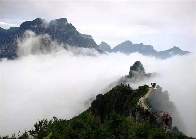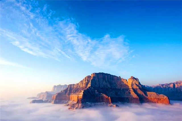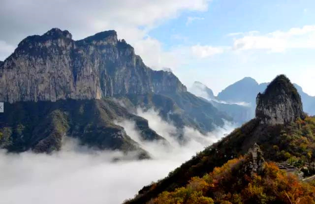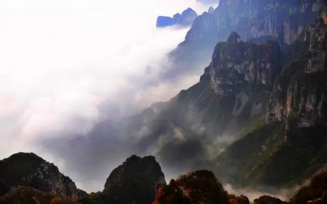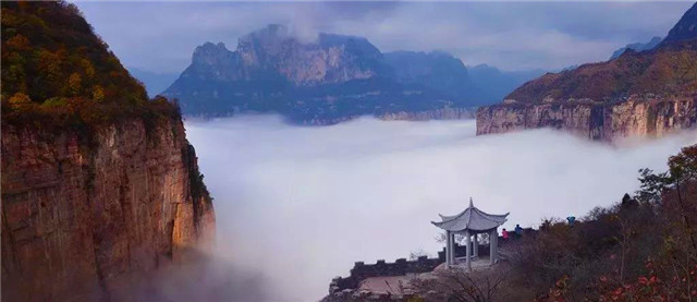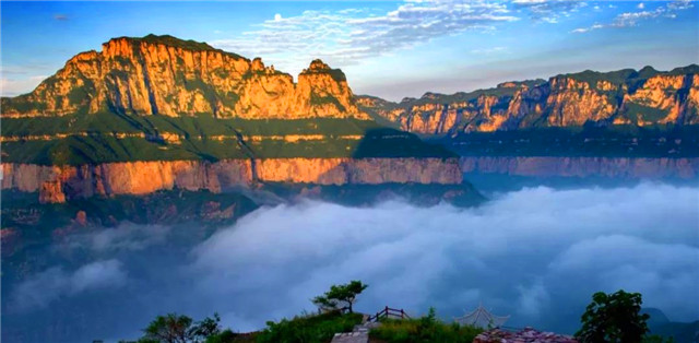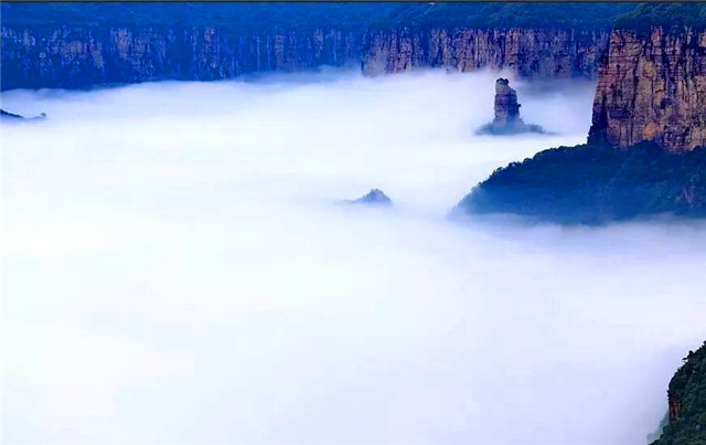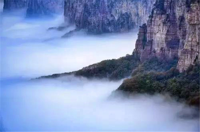 天界山的老爷顶因处在一座四面绝壁环崖的山顶,太行云海胜景因地势、海拔和气候常在老爷顶四周峡谷中蒸腾升起。