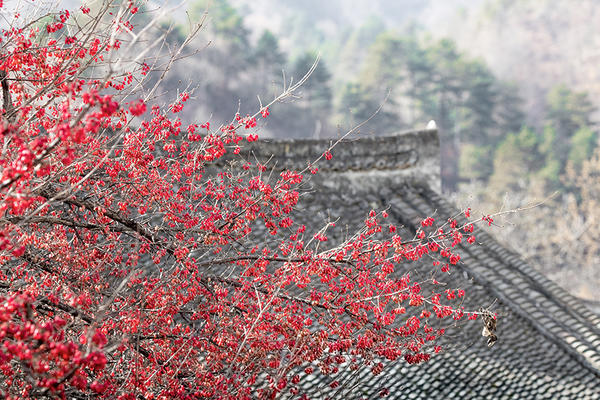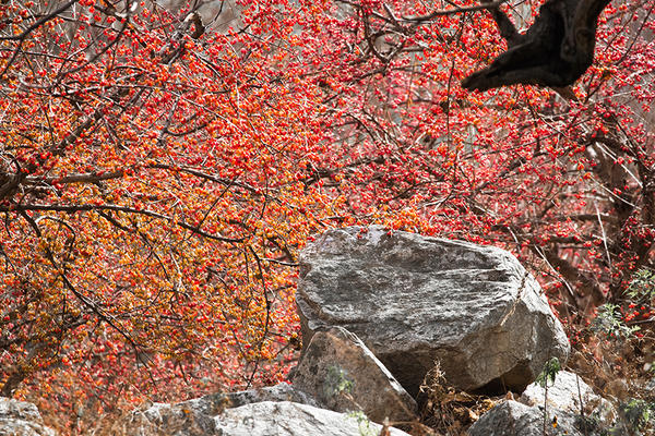 初冬,河南伏牛山区山茱萸又迎来了一个丰收年,满山坡的山茱萸红彤彤。