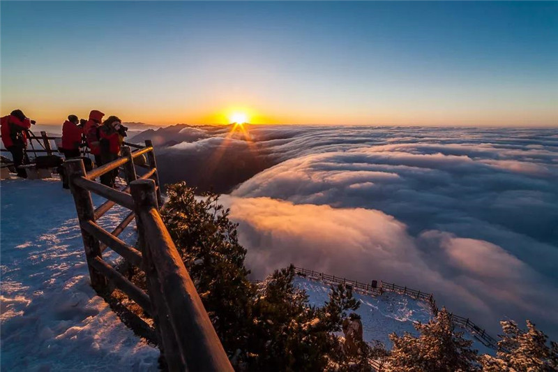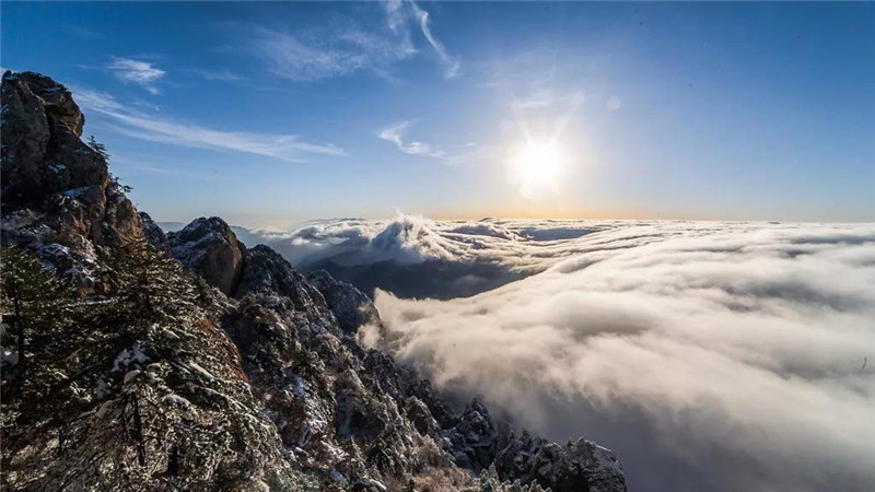 老君山的美又是那样的清静无为,清晨里一缕阳光透过云层洒向老君山,让老君山一下子布满了金光,刹那间,老君山显得那么的庄严肃穆,朝阳冉冉升起,展示着老君山最雄伟最瑰丽的日出美景。