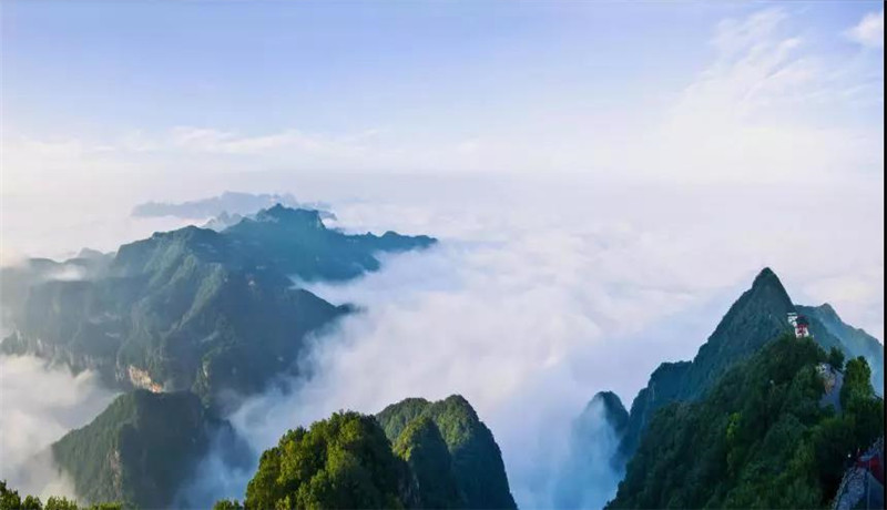 站在天坛峰顶,俯望来时山间道路,远眺城市喧闹繁华,头顶是望不尽的蓝天白云,呼吸着清新空气,感受山河美景尽在胸怀之间。