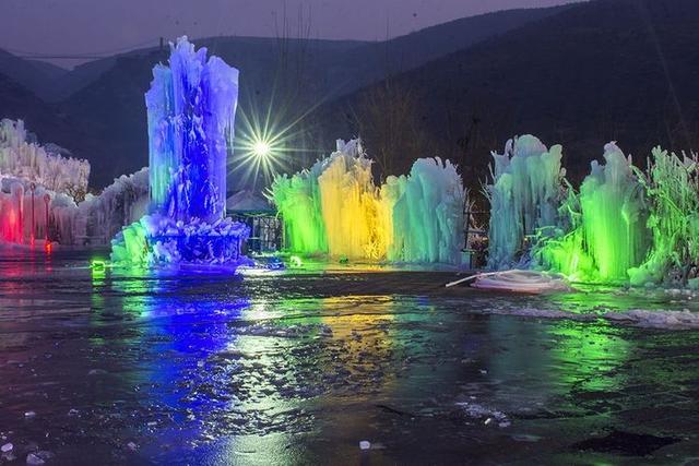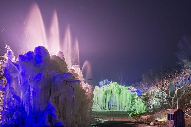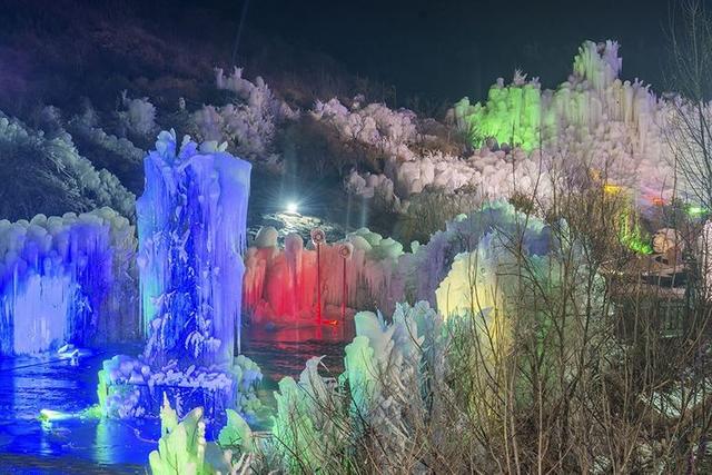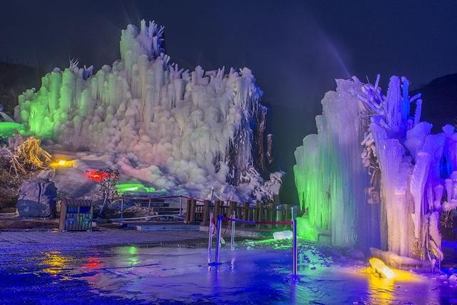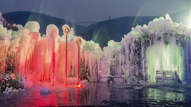 夜晚,在五彩缤纷的灯光映照下,原本在白天里透着清冷冰蓝的冰挂,摇身一变,显得鲜明生动。
