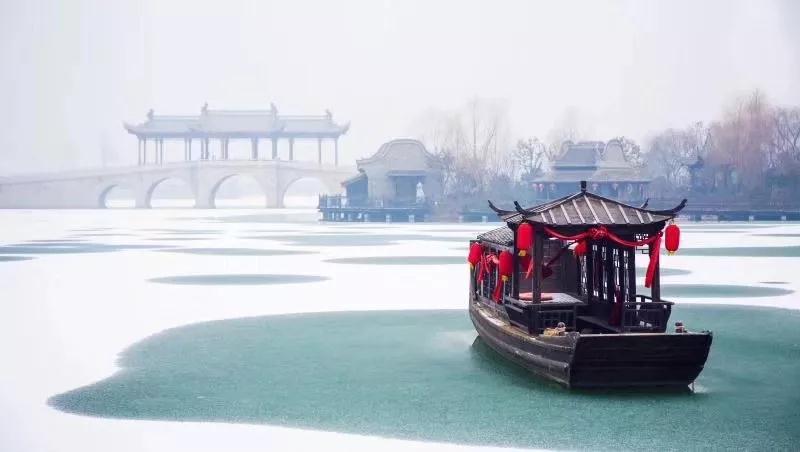 冰封在湖上的乌篷船孤零零的停在那里,与状元桥一起默默欣赏着这冬日里冰雪童话般的世界。