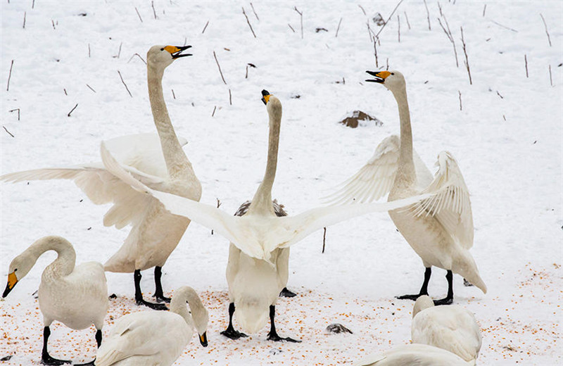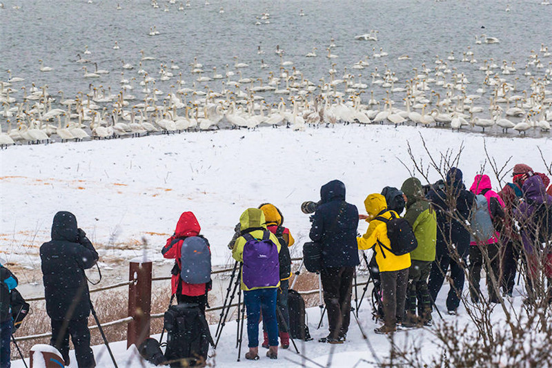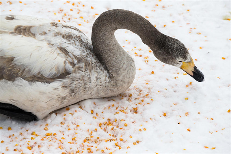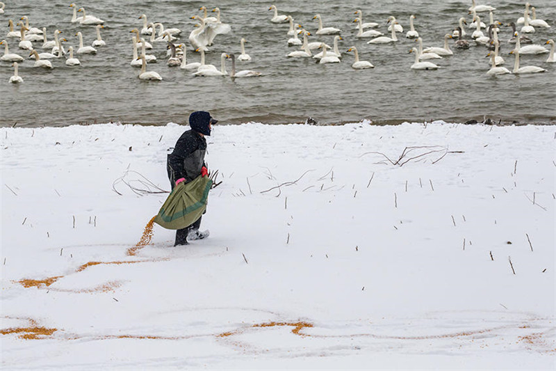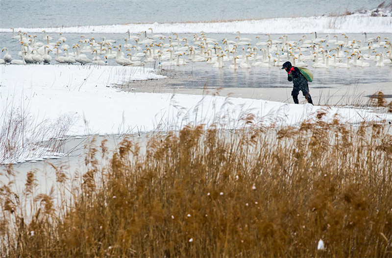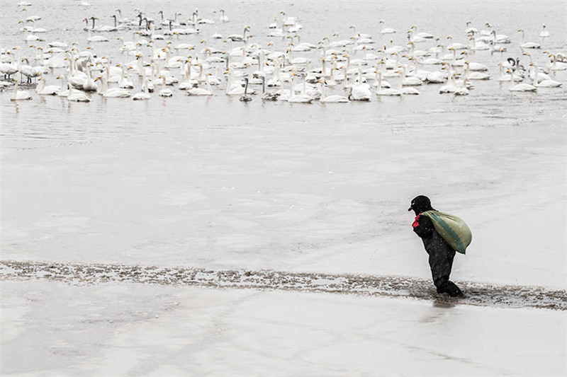 岂不知,为留住这些白天鹅,湿地保护工作人员付出了太多的艰辛。寒风凛冽中,他们踏冰送粮,确保天鹅每天都能饱餐。