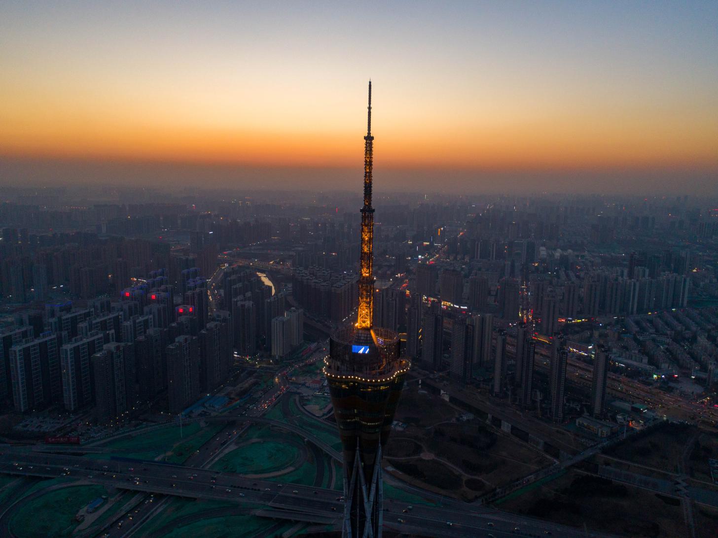 日落后,地标建筑中原福塔也掩映在高颜值风光之中。
