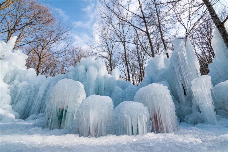 白云山森林氧吧处处冰山玉树琼林,那些冰挂晶莹剔透、造型各异,似利剑,如帘幕,十分壮观。