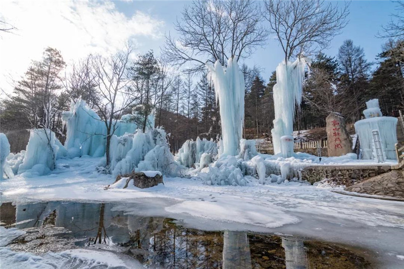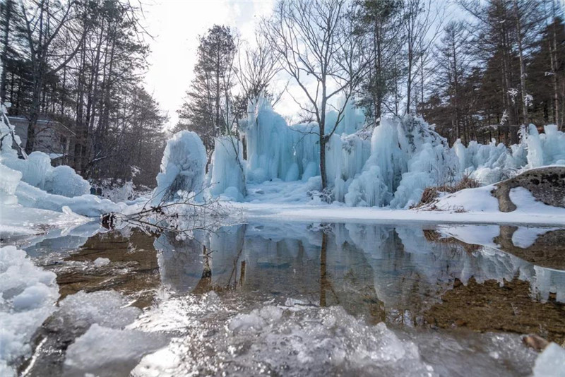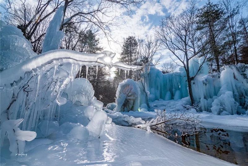往日流水潺潺的清流,凝结成洁白的“玉带”在山间,九龙河谷内,白龙瀑,黑龙潭,黄龙井,那美丽的瀑布定格于冰点,凝固的一瞬间,令无数人向往。
