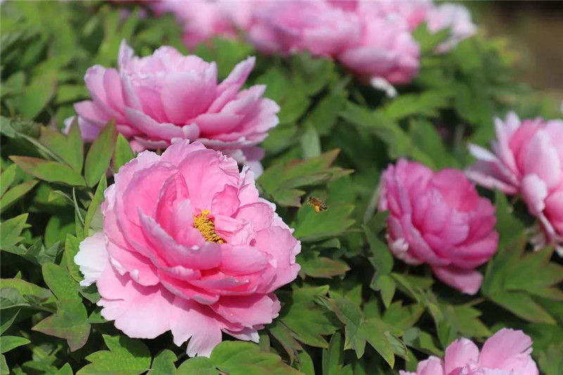 粉色以粉中冠、白色以景玉较为出名,其中,牡丹花名品有凌花湛露、银红巧对、仙女争春、玉面桃花等。