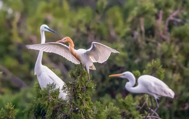 每天,鹭鸟们成群结队地在小岛上空翱翔,千姿百态,美不胜收。鹭鸟们或盘踞枝头,交头接耳,窃窃私语;或展翅飞翔,一鸣惊人。