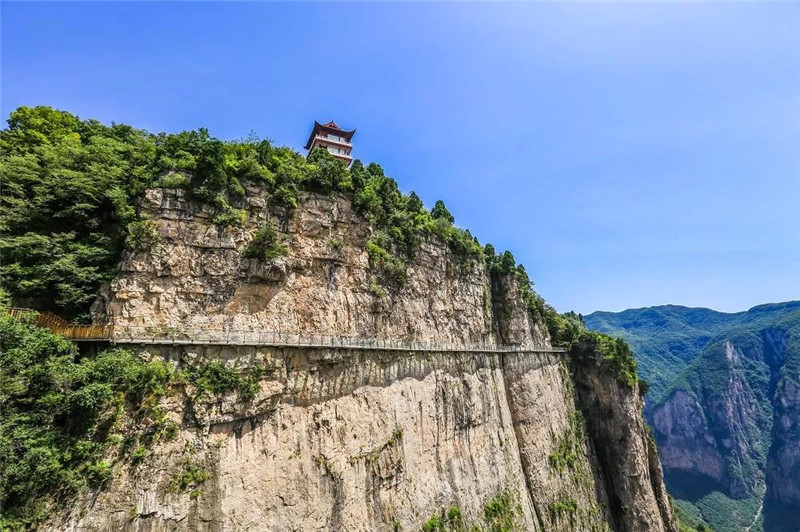 在海拔1080米的半山腰上,依崖而建的玻璃栈道,上下临空,视野开阔,站立之上,有腾云之势,可览众山之姿。