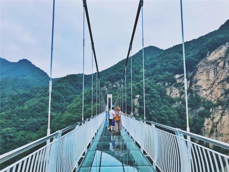 最高处往下看,底下都是悬崖绝壁,整个人仿佛浮在空中,走在上面晃晃悠悠的,非常刺激惊险,脚踩在玻璃天桥上,犹如立在云端。