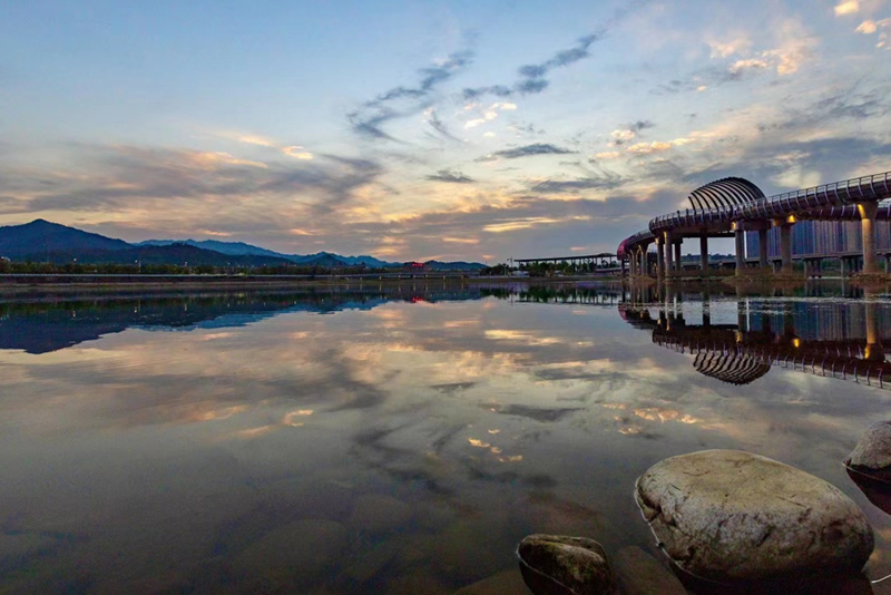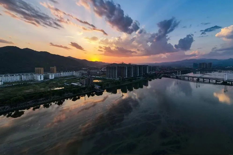 晚霞中的西峡,灯火倒映在两岸之间