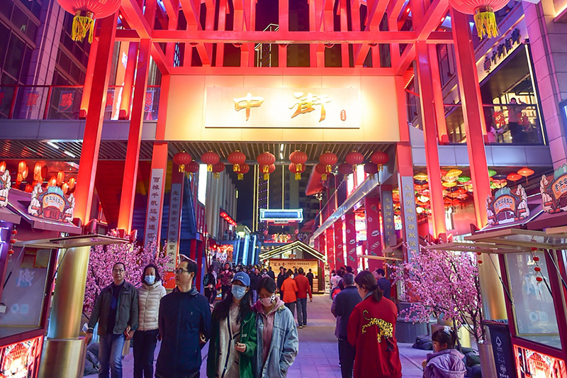 4月7日晚,游客在河南省洛阳市瀍河区“洛城中街”文商旅综合体街区休闲游玩。