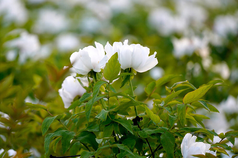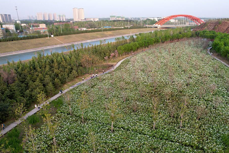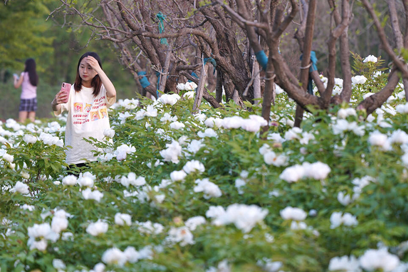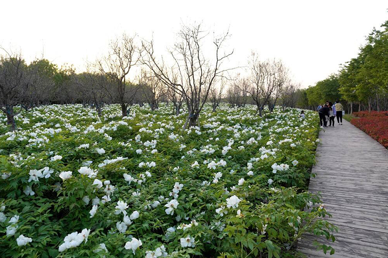 4月11日,郑新快速通道南水北调桥西侧不远处的渠南岸,百亩白色牡丹集中开放,洁白的花朵在风中摇摆,牡丹田蔚为壮观。