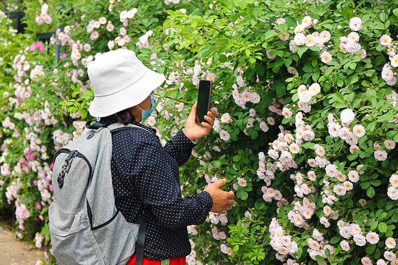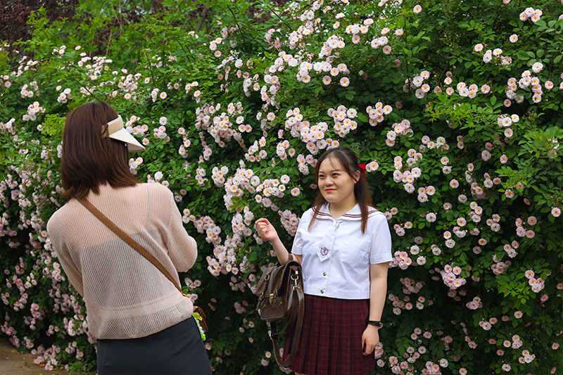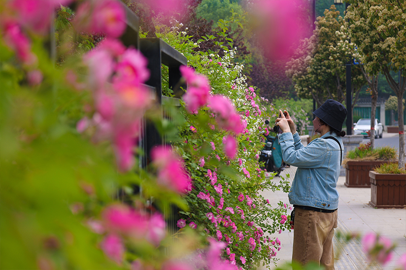近日,开封市区多条道路上的蔷薇花争相盛放,吸引市民、游客前去打卡拍照。白色、粉白、玫红,千枝万枝,朵朵小花缀满枝头,营造出生意盎然的春意。