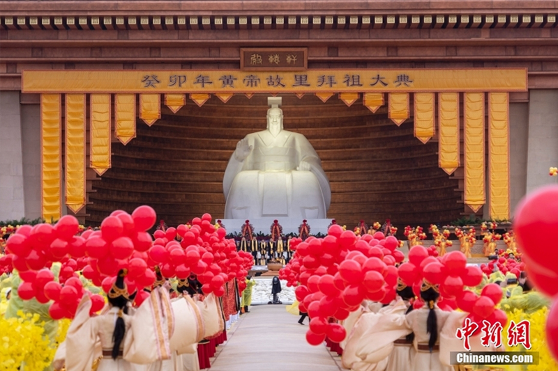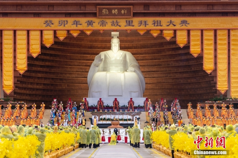 4月22日,河南新郑,癸卯年黄帝故里拜祖大典在雨中如期举行。来自海内外的华夏儿女冒雨祭拜人文始祖黄帝。图为拜祖大典“天地人和”环节。