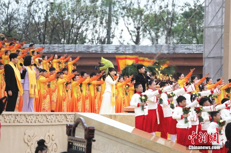 4月22日,河南新郑,癸卯年黄帝故里拜祖大典在雨中如期举行。来自海内外的华夏儿女冒雨祭拜人文始祖黄帝。图为拜祖大典“高唱颂歌”环节。