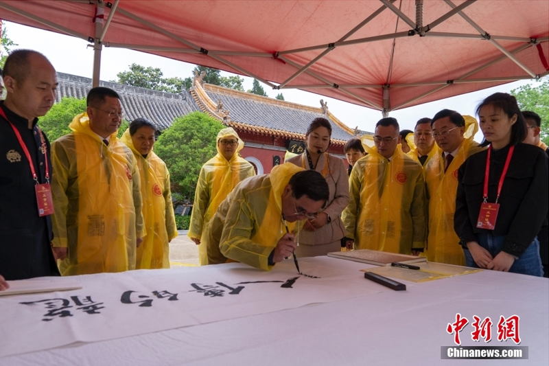 4月22日,河南新郑,癸卯年黄帝故里拜祖大典雨中如期在举行。来自海内外的华夏儿女冒雨祭拜人文始祖黄帝。图为新党主席吴成典在黄帝故里祠前留下墨宝。