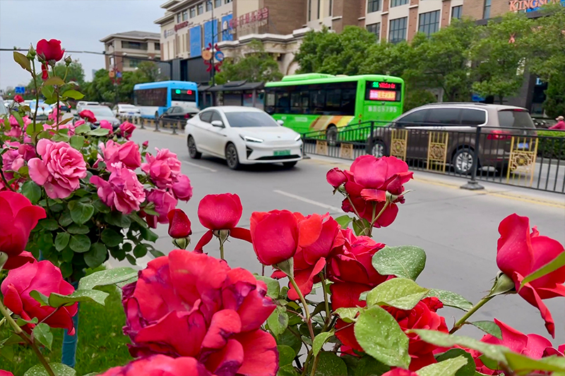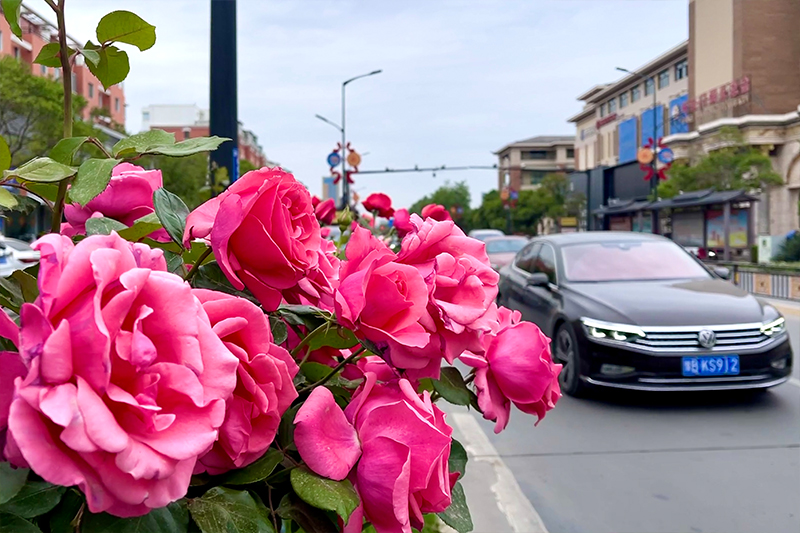 4月21日,晋安路两侧绿化带内月季花盛放,娇艳的花朵把街头装扮得绚丽多彩,为古城增添了一道独特的风景。