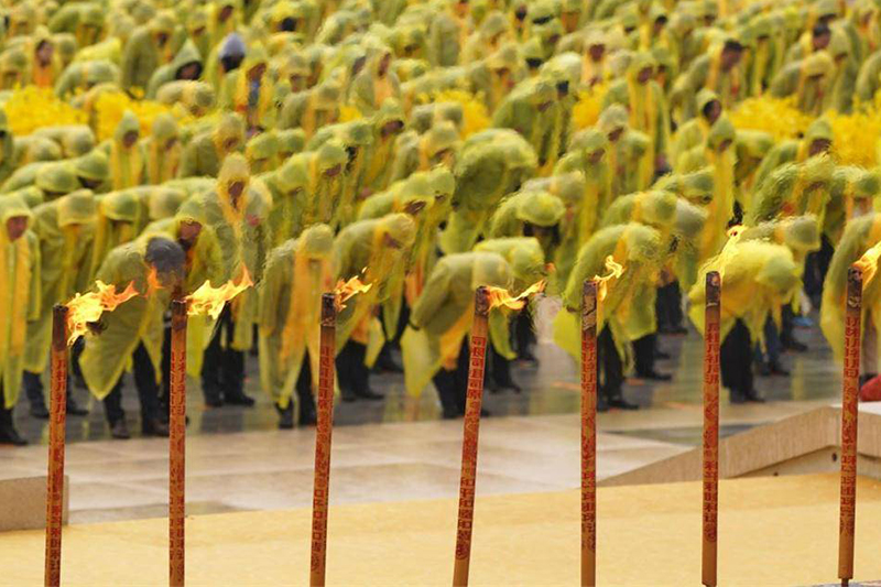 大典共有盛世礼炮、敬献花篮等九项仪程,最后和平鸽与祈福气球高飞,现场一片欢腾。
