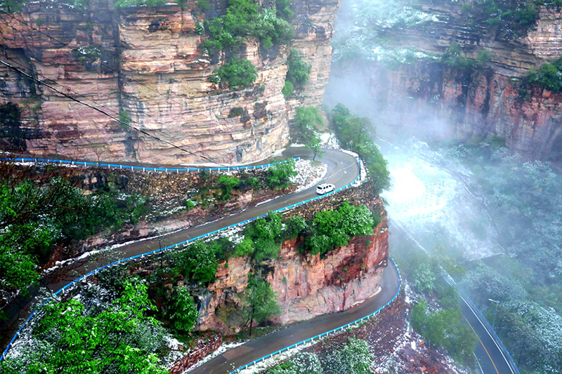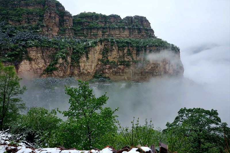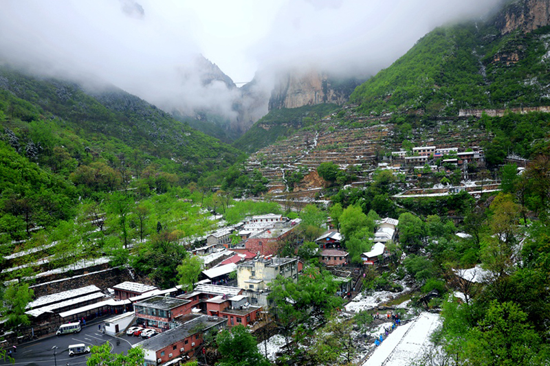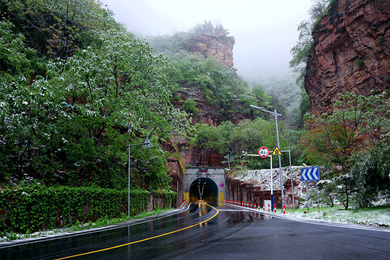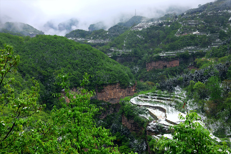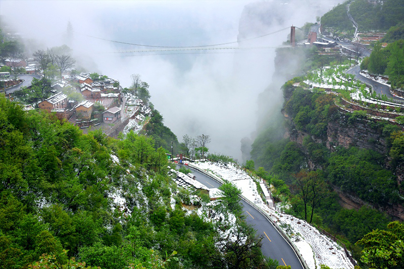 4月22日,河南省安阳市林州太行大峡谷再次喜降春雪,洁白如玉的春雪、郁郁葱葱的青山、胜似仙境的云海、层次分明的梯田和独具特色的民居相互映衬,彼此衬托,构成一幅唯美的生态画卷,置身其中,令人心旷神怡,流连忘返。太行天路盘踞青山,宛如巨龙。秦加福摄