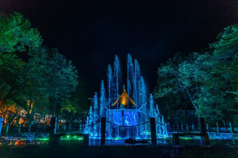 夜色来袭,光影流动。随着最后一抹日光的消失,鸡公山便披上了璀璨的“外衣”。灯光就像五颜六色的焰火溅落人间,流光溢彩的景观灯装饰下,呈现出美轮美奂的夜间景色。