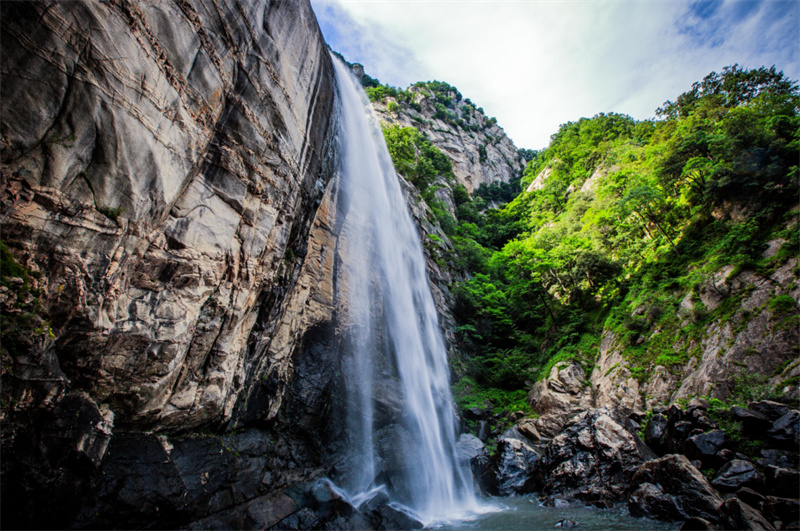 群山环绕,林海如烟,山中的春景一片欣欣向荣,冰雪早已消融,瀑布飞流而下似银河。