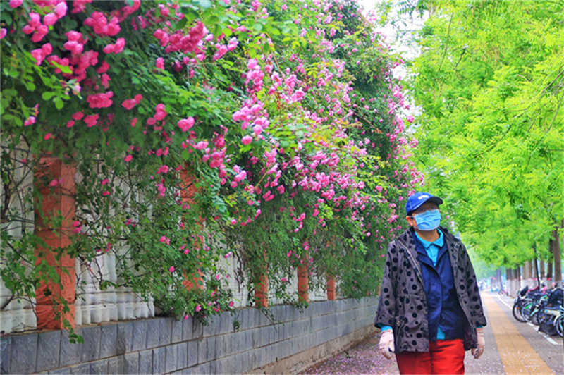 时下,金明大道旁的蔷薇花竞相开放,美不胜收,吸引过往市民驻足欣赏、拍照。