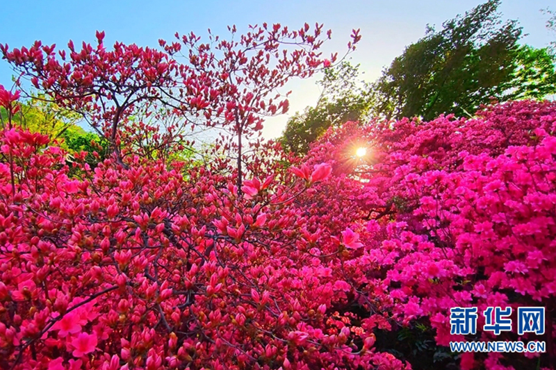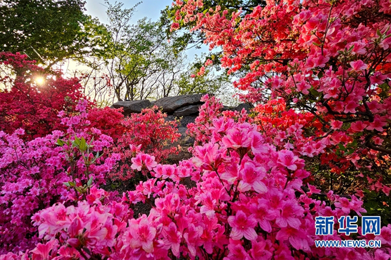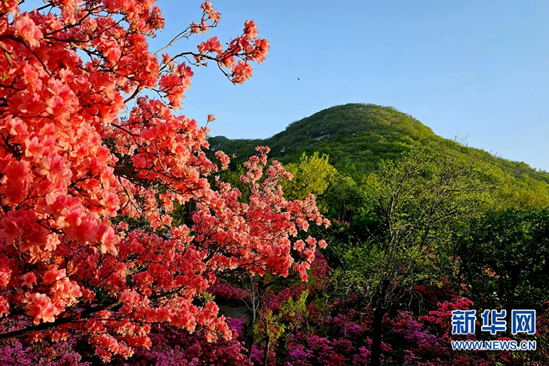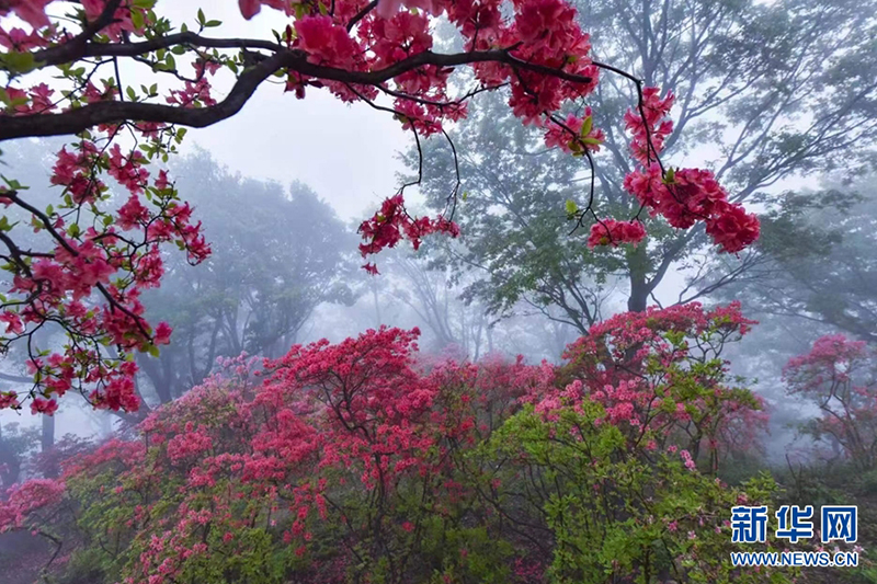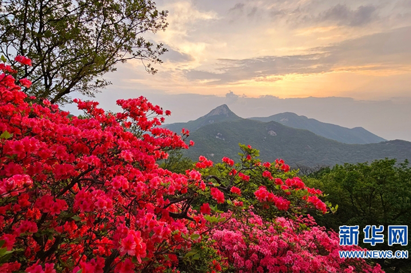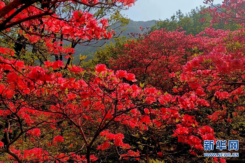 近日,在河南省南阳市桐柏县桐柏山淮源风景名胜区内,漫山遍野的映山红竞相绽放,颇为好看。
