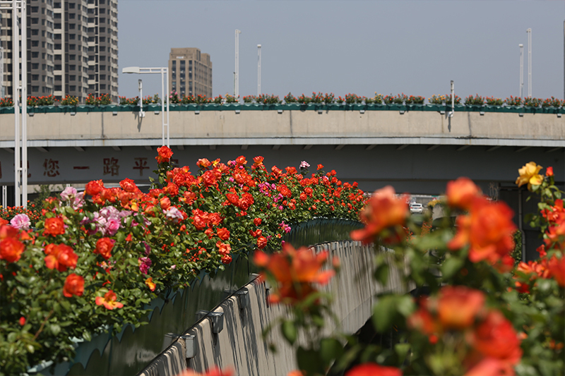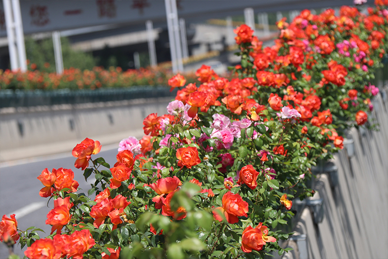 高架桥上其它月季品种,莫海姆、安吉拉、仙境等,或淡雅、或清香,都是适应郑州环境、花期长、花量大、抗性强的品种。多品种、多色彩的搭配栽植,形成一桥一景的景观。