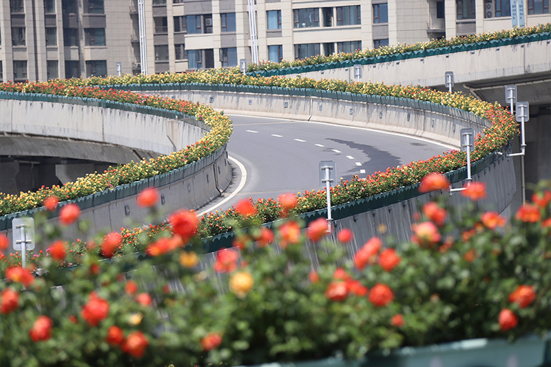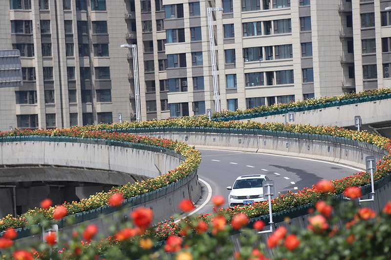 行驶在陇海路西三环高架上,红、黄花朵交替呈现,仿佛车在花中行,一路繁花,一路芬芳。