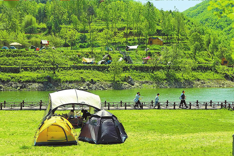 5月1日,汝阳县付店镇大步湾水库,游客在山沟里搭建帐篷,乐享快乐假期。康红军 摄