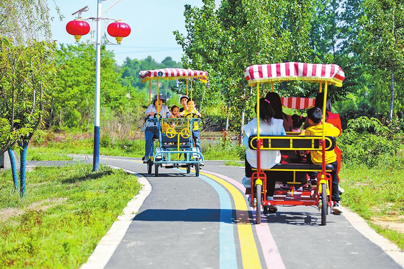 5月1日,游客在信阳市光山县孙铁铺镇陈大湾村景区观光游玩。“五一”假期,光山县“乡村游”火爆,游客来这里休闲放松,体验田园假期。谢万柏 摄