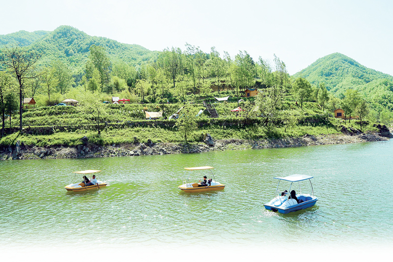 5月1日,在汝阳县付店镇大步湾户外露营基地,游客荡起小船在碧波荡漾的水面兴致勃勃地游玩,享受五一假期的美好时光。付店镇依托大步湾水库碧水蓝天,生态环境好自然资源优势,结合山区俊秀的特点发展乡村游,旖旎风光使游客慕名而来。康红军 摄