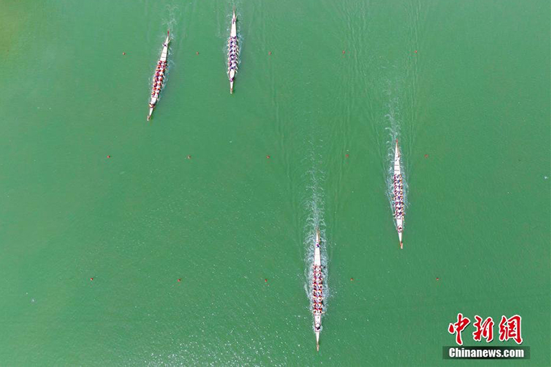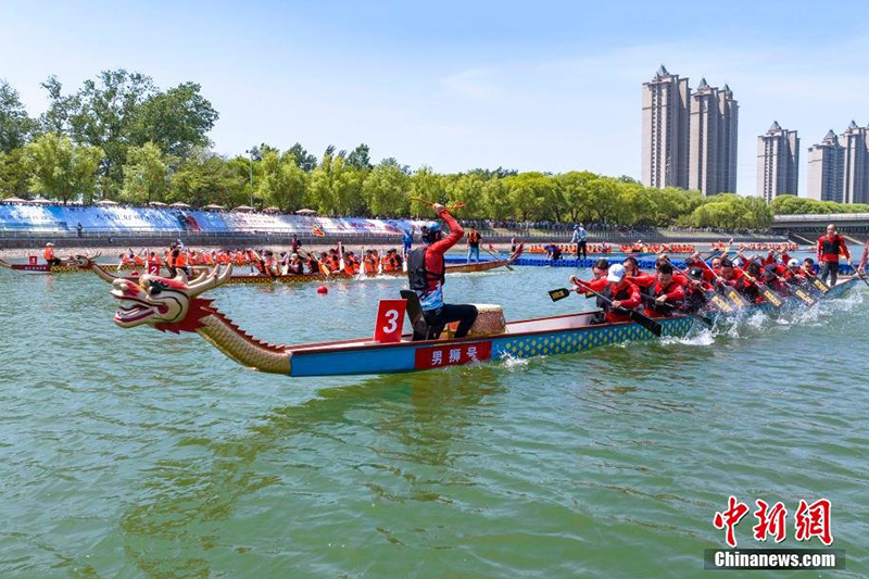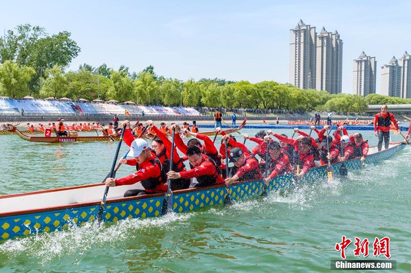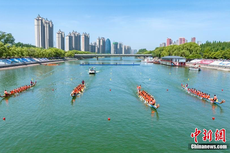 5月1日,河南省第十届“中华轩辕龙舟大赛”暨中国(漯河)美食嘉年华之2023年漯河市龙舟公开赛在沙澧河交汇处开幕。本次比赛为期两天,来自省内外88支队伍的1900多名运动员在此展开龙舟竞渡。图为比赛现场。