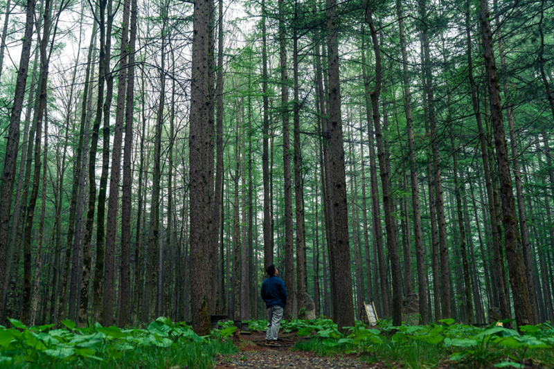微微小雨不影响观景,撑着一把伞漫步山中。
