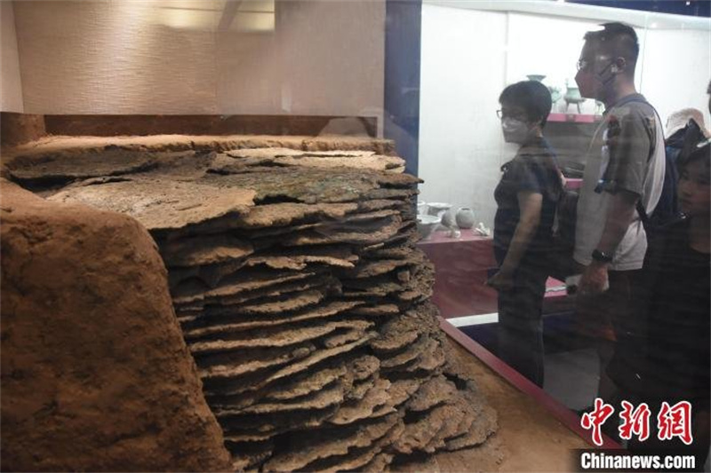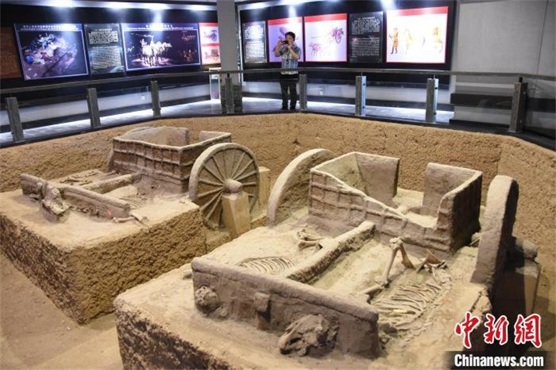 图为殷墟博物馆内展出的车衡、车辕、马头与铜质配饰。