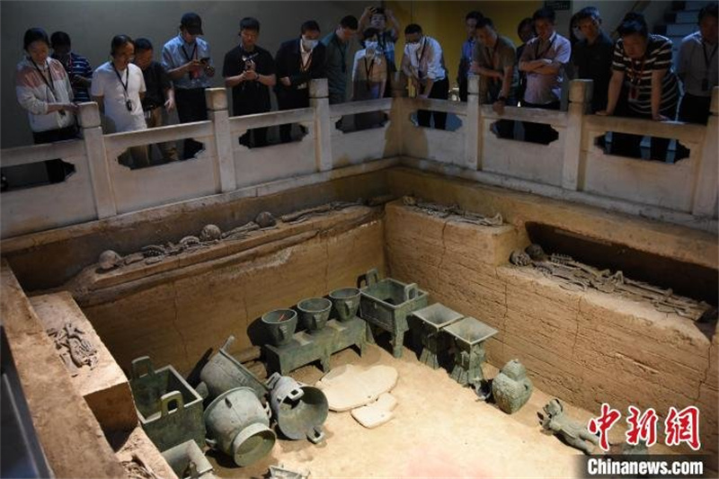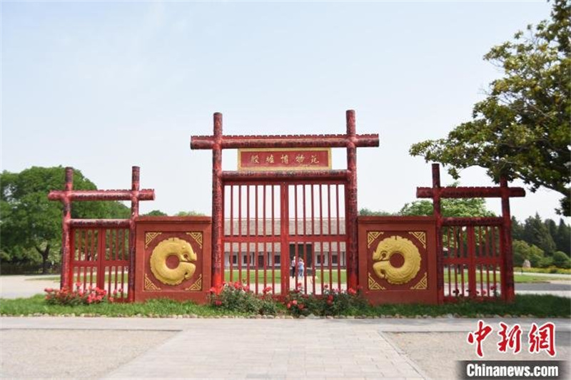 5月14日,“行走河南·读懂中国”文明探源集中采访活动团,走进河南省安阳市殷墟宫殿宗庙遗址和殷墟王陵遗址。殷墟是中国历史上第一个文献可考、为考古发掘所证实的商代晚期都城遗址。殷墟出土的甲骨文保存了3000年前的文字,把中国信史向上推进了约1000年。图为殷墟宫殿宗庙遗址根据甲骨文“门”的构形和殷商纹饰设计的大门。