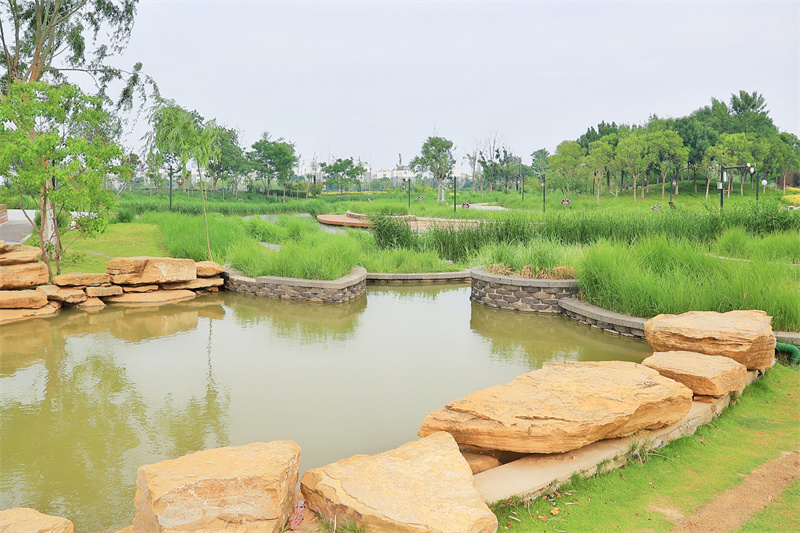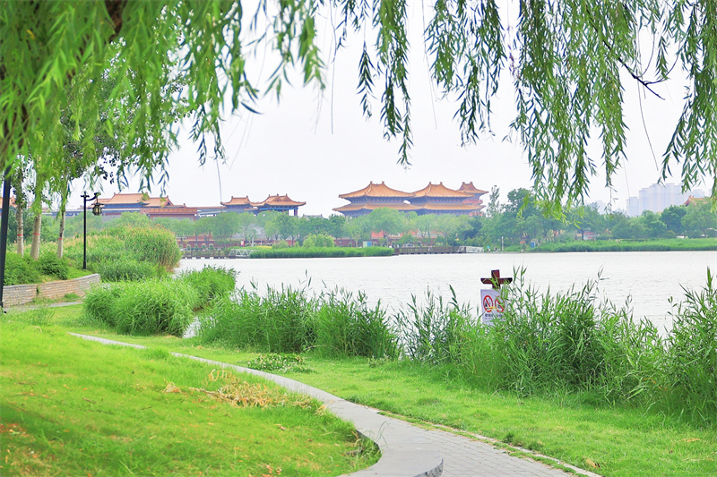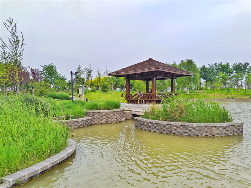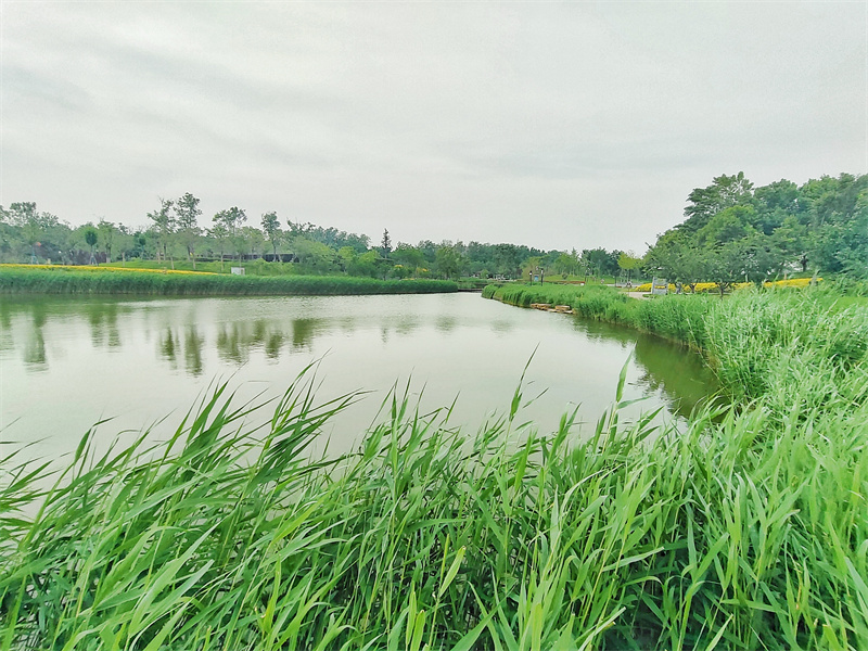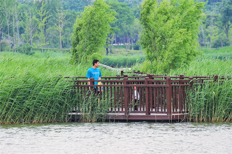 进入夏季,植被郁郁葱葱,西北湖湿地公园绿意盎然,美如画卷。