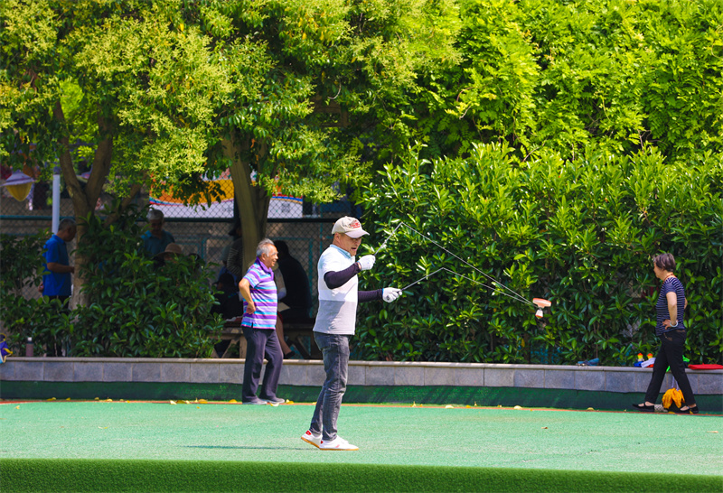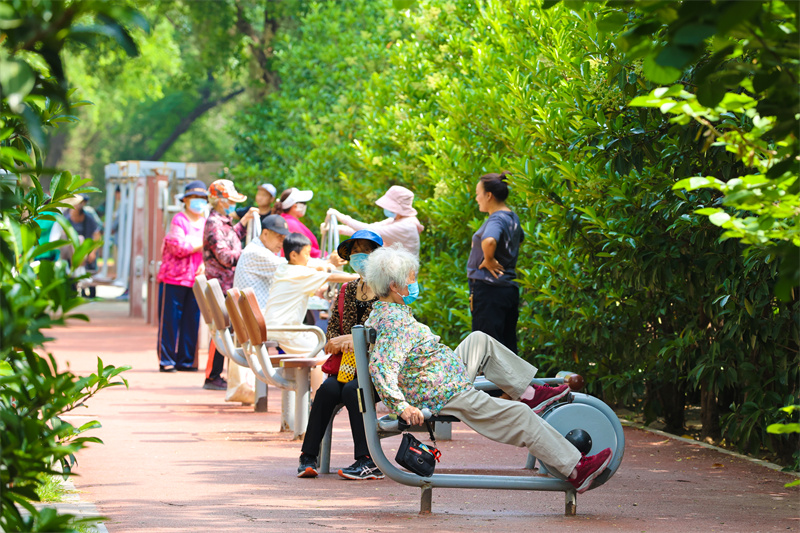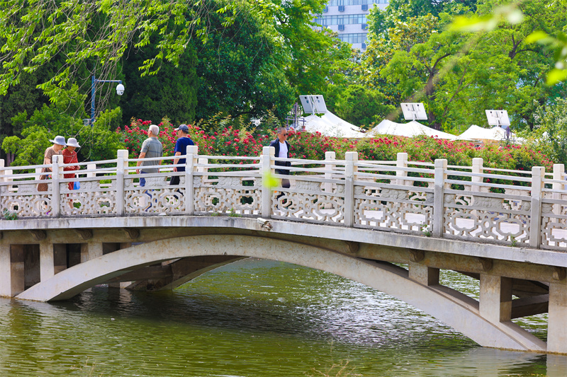 初夏时节,汴京公园内水清、树绿、花香,风景美如画,是众多市民休闲健身的好去处。