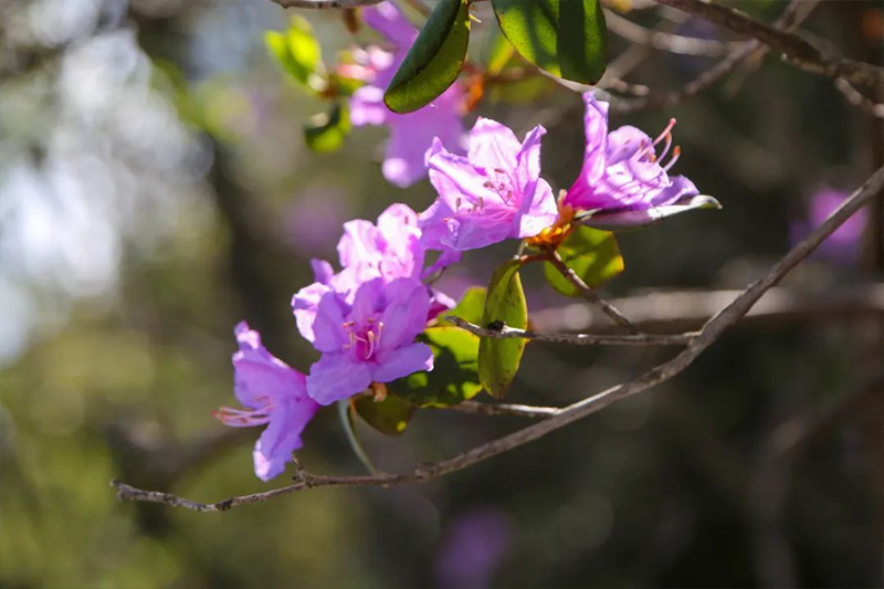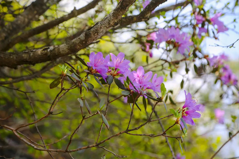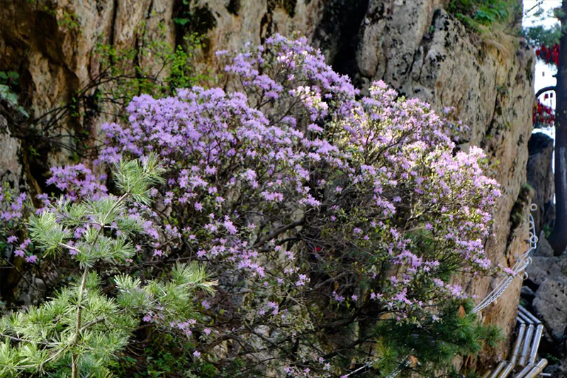 另一种是呈淡粉红色或近似白色的太白杜鹃,花朵中间有紫色斑点,分布在山顶太白坡、下山栈道等,花期5~6月。