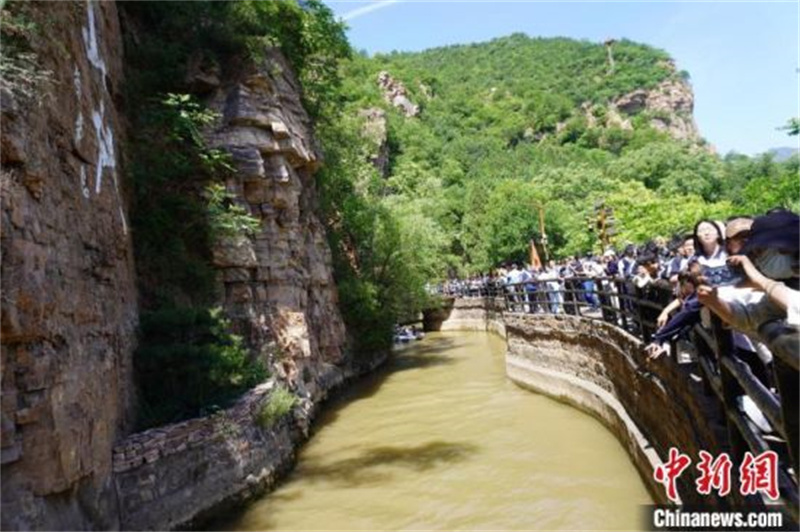 走访青年洞,近距离聆听红旗渠水奔涌向前的声音。为解决吃水难题,林县(林州市旧称)人民在20世纪60年代用10年时间绝壁穿石,修筑长达1500公里的红旗渠工程。图为红旗渠青年洞。 韩章云 摄